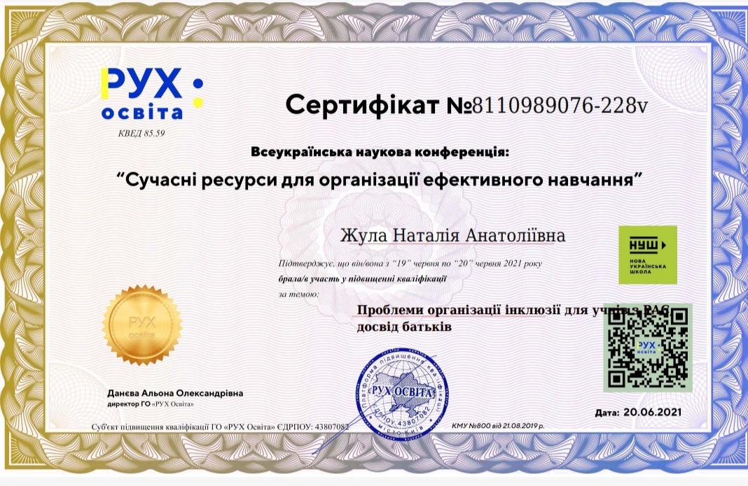 - інклюзивна компетентність, створення безпечного та інклюзивного освітнього середовища, особливості (специфіка) інклюзивного навчання, забезпечення додаткової підтримки в освітньому процесі дітей з особливими освітніми потребами