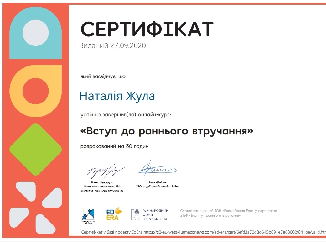 Фахівчиня зі Вступу до раннього втручання, з питань інклюзивного навчання дітей з особливими потребами