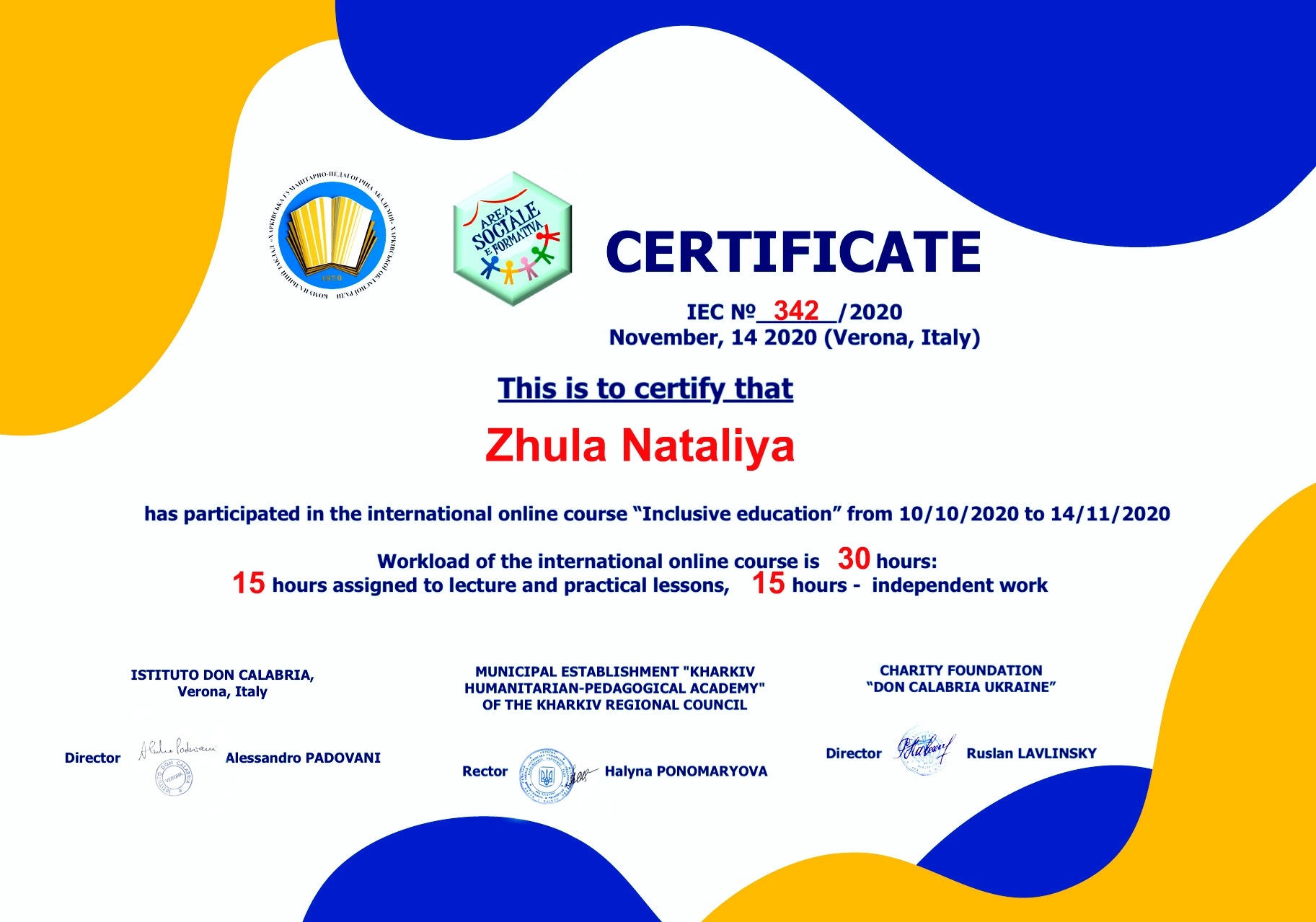Аспірантка кафедри Соціальної роботи в КЗ “Харківська гуманітарно-педагогічна академія” ХОР. Займаюсь науковим дослідженням з теми: “Неформальна освіта суб'єктів соціальної підтримки дітей з аутизмом в інклюзивному середовищі”