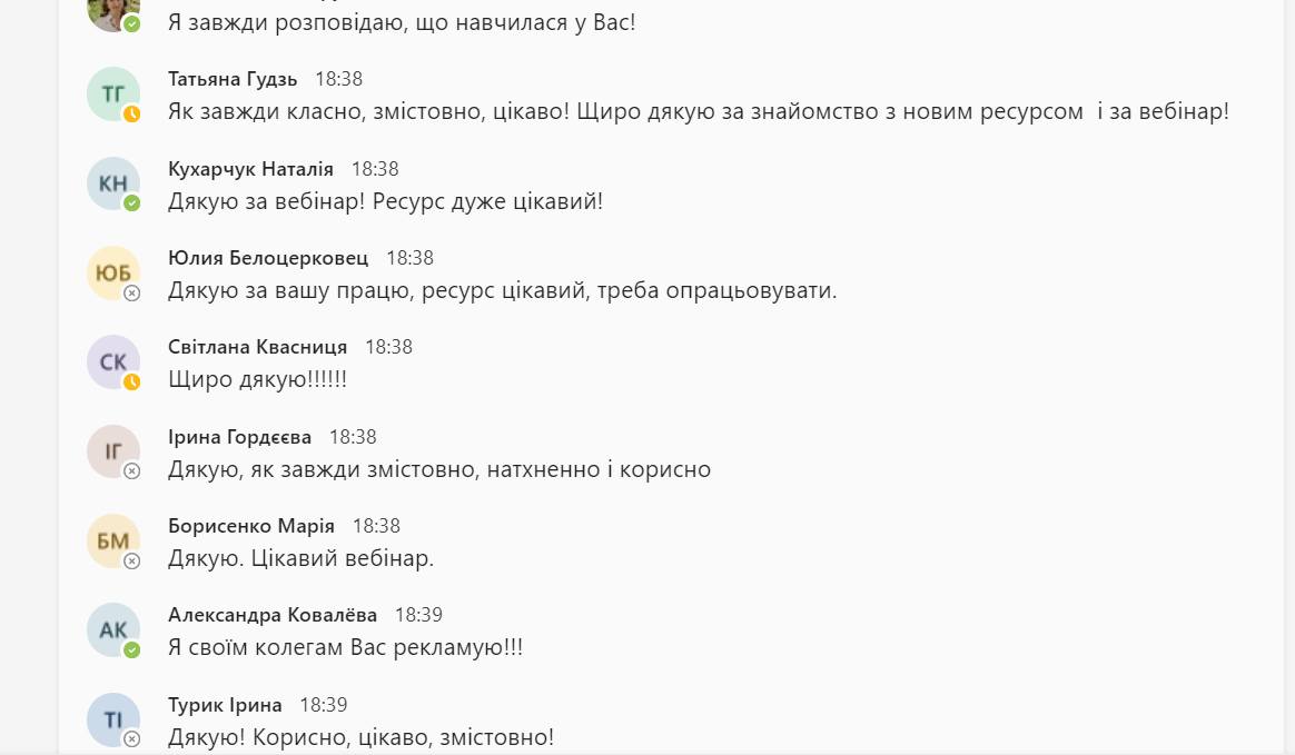 - Всі наступні вебінари розпочинаються з аналізу помилок за міжвебінарний період, не зважаючи, що помилки аналізуються і в закритій групі. Це сприяє тому, що колеги ґрунтовно опановують застосунки..