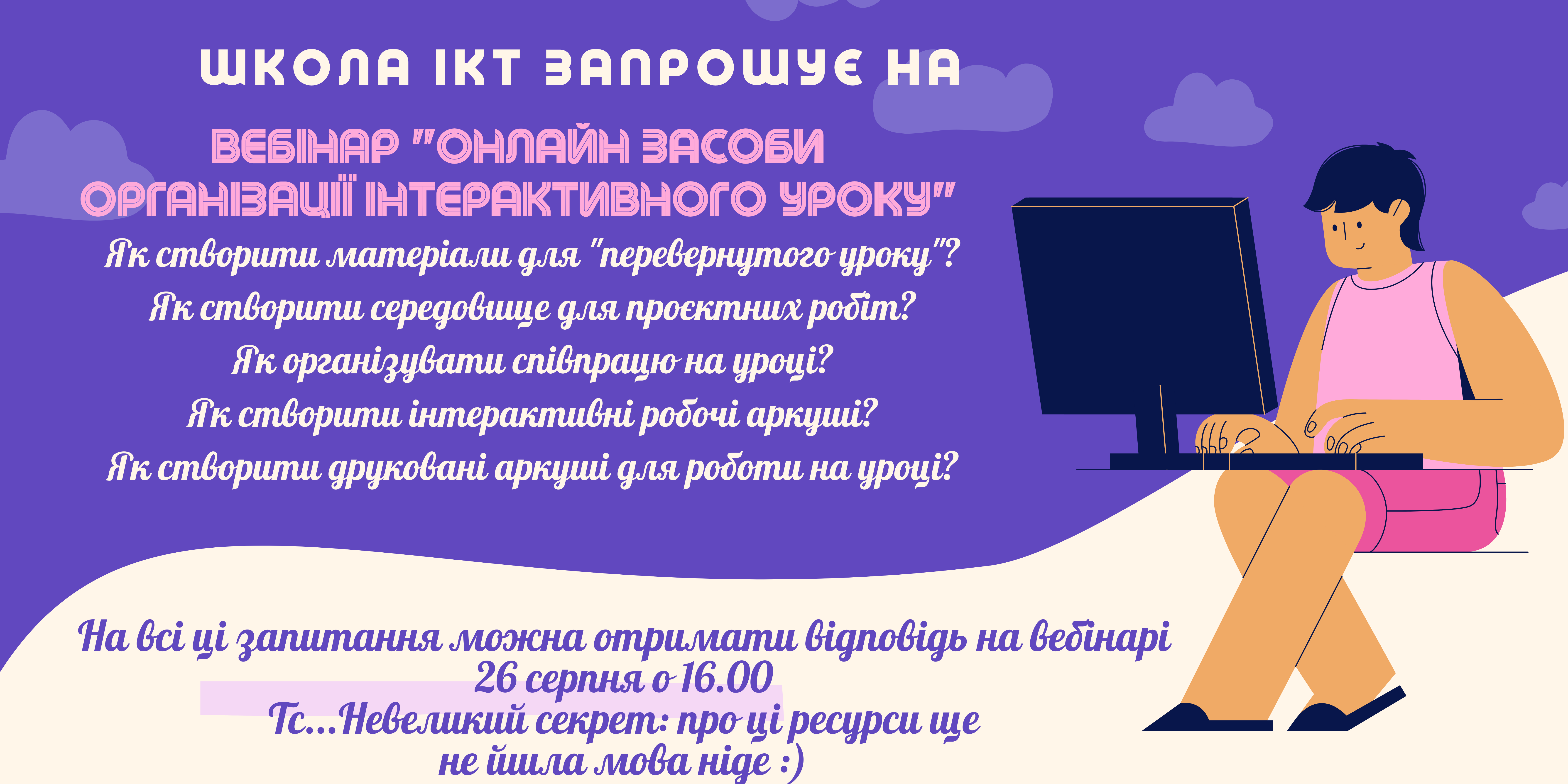 Пропоную навчання в освітньому проєкті "Школа ІКТ". Можу поділитись знаннями не про одну сотню онлайн - застосунків та ідеями щодо їх практичного використання. Навчання на уроках-вебінарах гнучке, відповідно до побажань учасників,