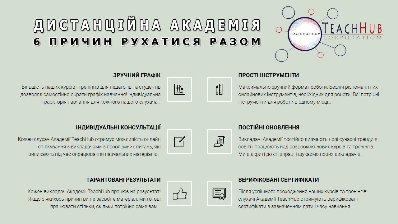 Дистанційна академія TeachHub - місце нових можливостей для педагогів: продуктивного навчання, цікавого спілкування та професійного розвитку.