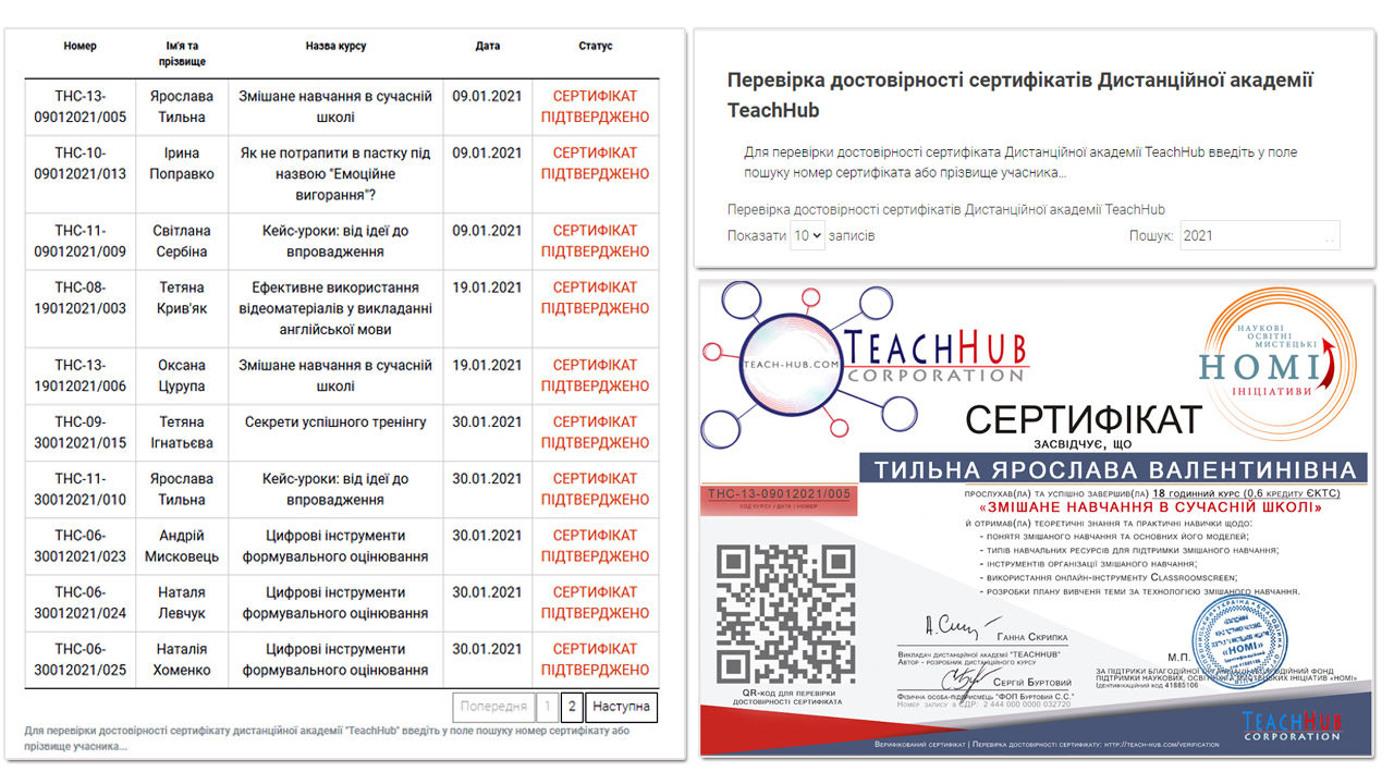 Після успішного проходження курсів та тренінгів слухачі Дистанційної академії TeachHub отримують верифіковані сертифікати із зазначенням дати, часу та результатів навчання, які будь-якої миті можна перевірити на нашому сайті http://teach-hub.com/verification.